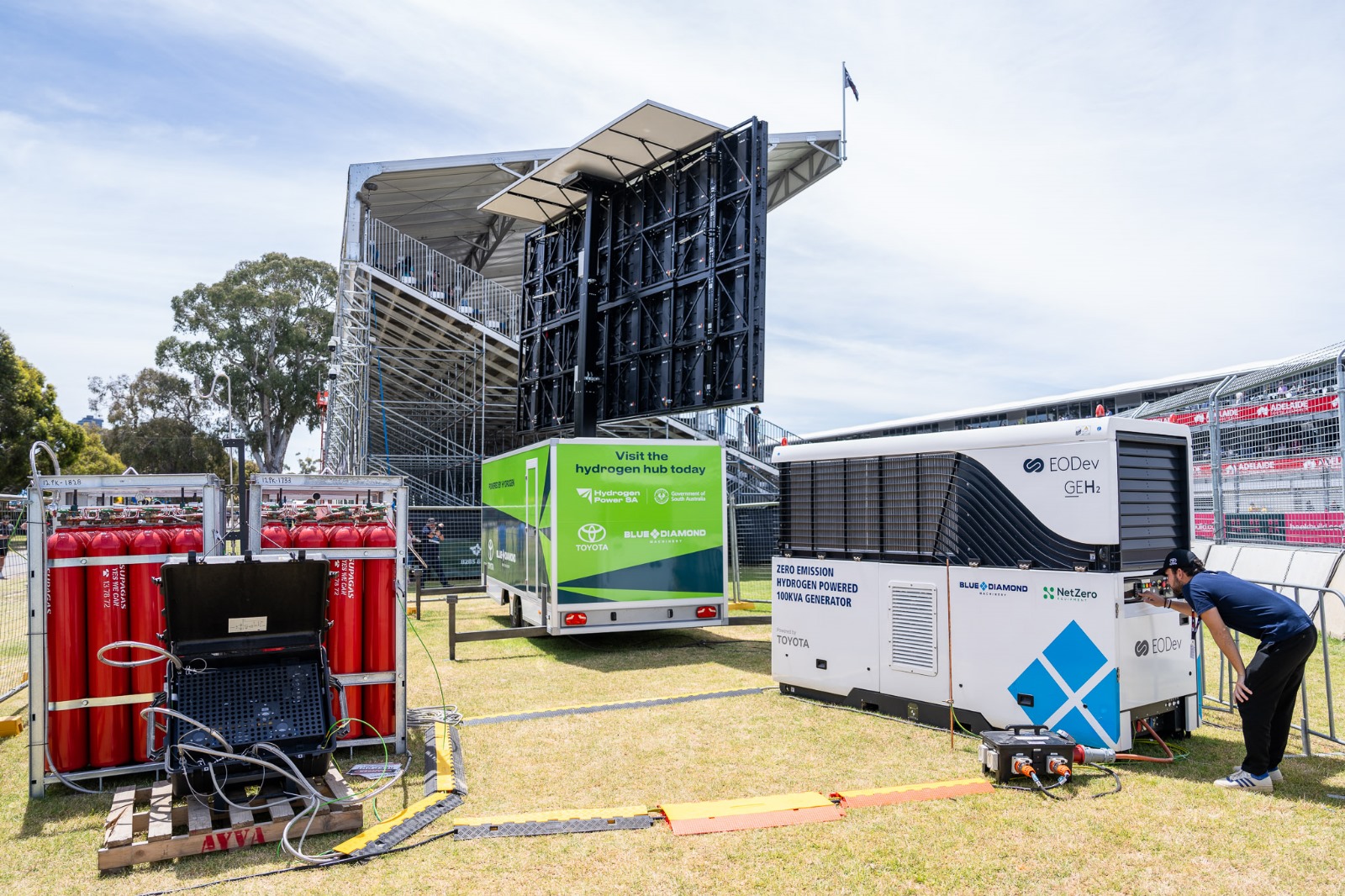 This year, the event will incorporate clean energy technology for the Adelaide Street Circuit, with several EODev GEH2 Hydrogen Generators powering some of the event screens and a new ‘Hydrogen Hub’. This is thanks to a new collaboration between event organisers, the Office of Hydrogen Power South Australia, Toyota Australia and Blue Diamond Machinery.